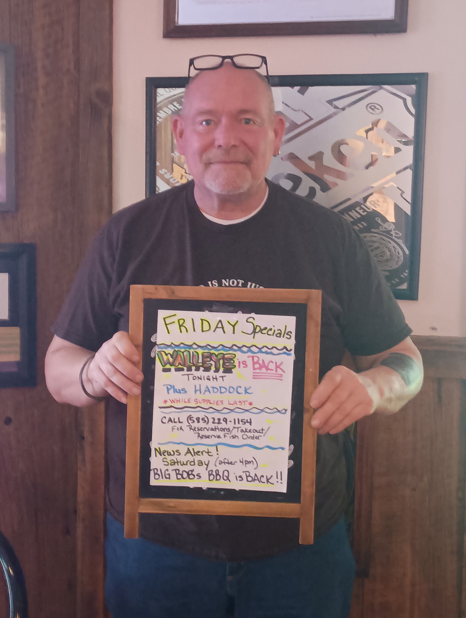 Friday special: WALLEYE IS BACK!! Plus fresh haddock. Call 585-229-1154 for reservations, takeout, and to reserve a fish order. Saturday special: AFTER 4PM, BIG BOB'S BBQ IS BACK! We'll see you soon :)