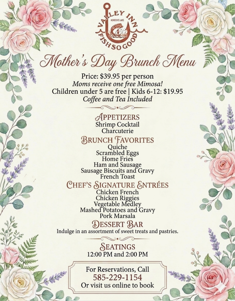 🌸 $39.95 per person 🥂 Moms receive a FREE mimosa 👧 Kids under 5 eat FREE | Ages 6–12: $19.95 ☕ Coffee & tea included From shrimp cocktail + charcuterie to quiche, French toast, chicken French, pork marsala, and more—there’s something for everyone to love ❤️ 🕛 Seatings at 12 PM & 2 PM 📞 Call 585-229-1154 to reserve your table or go on our website to reserve online! Spots will fill quickly—make this Mother’s Day one to remember 💕