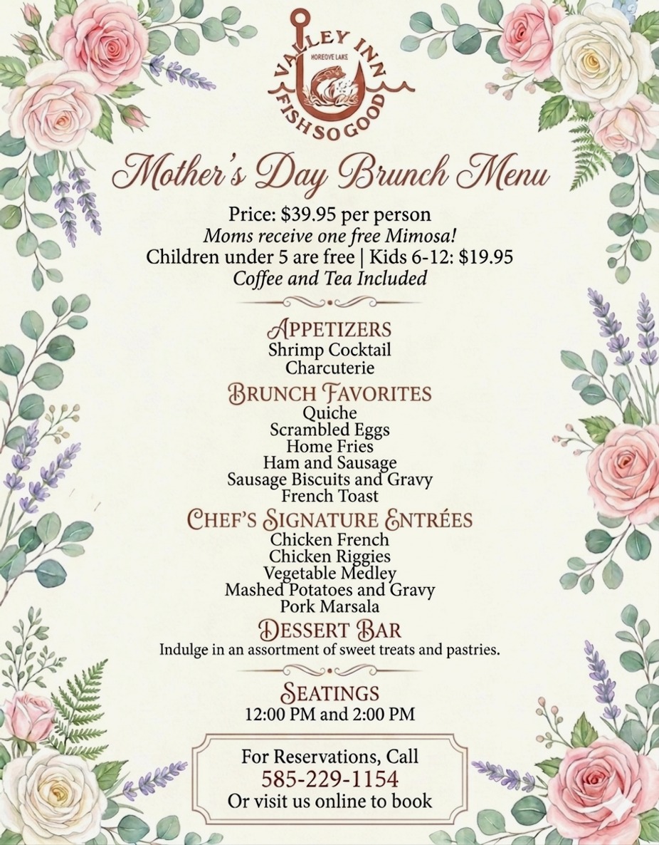 🌸 $39.95 per person 🥂 Moms receive a FREE mimosa 👧 Kids under 5 eat FREE | Ages 6–12: $19.95 ☕ Coffee & tea included