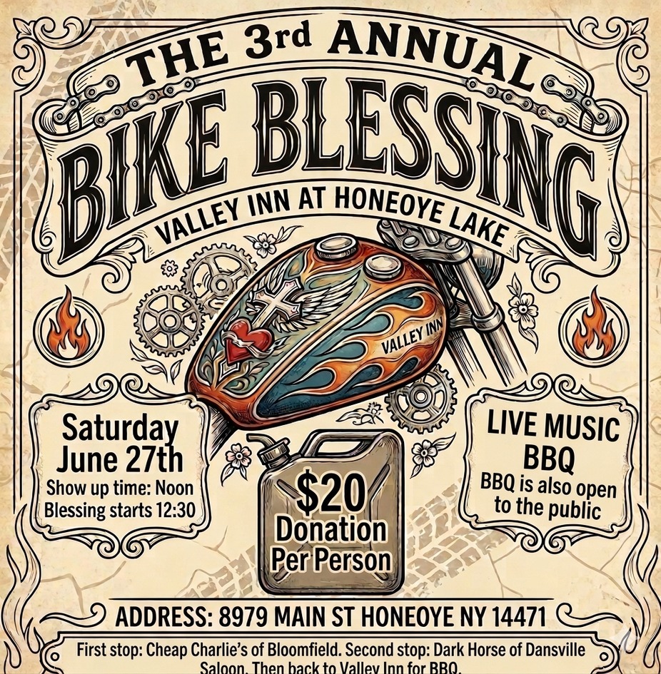 Join us for the 3rd Annual Bike Blessing at Valley Inn on Honeoye Lake! 📅 Saturday, June 27th ⏰ Show up at Noon | Blessing starts at 12:30